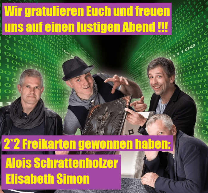 Wir gratulieren ALOIS SCHRATTENHOLZER und ELISABETH SIMON zu 2*2 Freikarten.